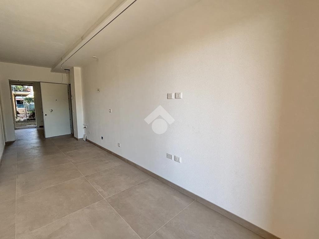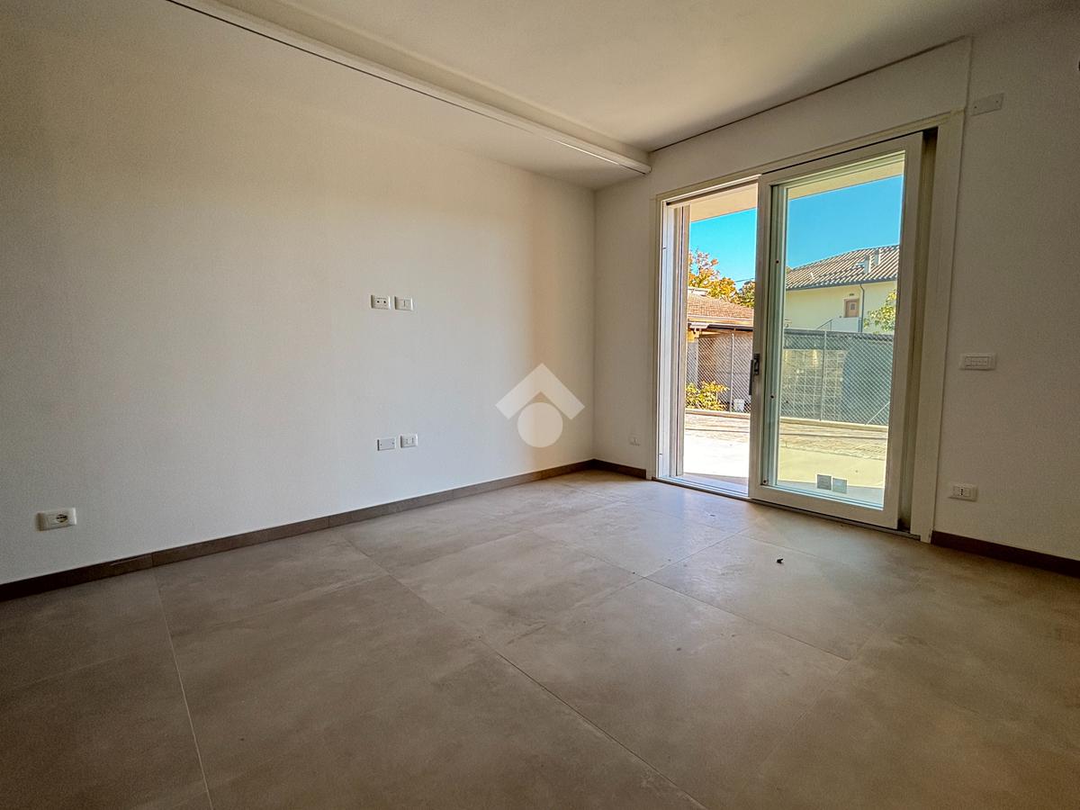 Internamente, la soluzione presenta un open space perfettamente divisibile in due ambienti, grazie alle porte finestre che si affacciano sul giardino.
