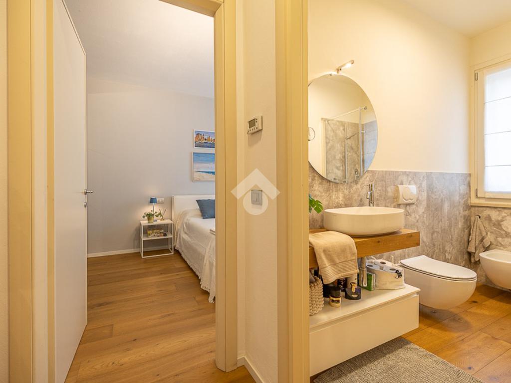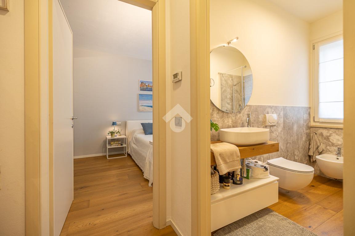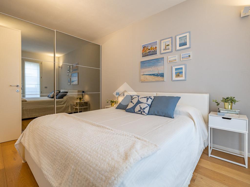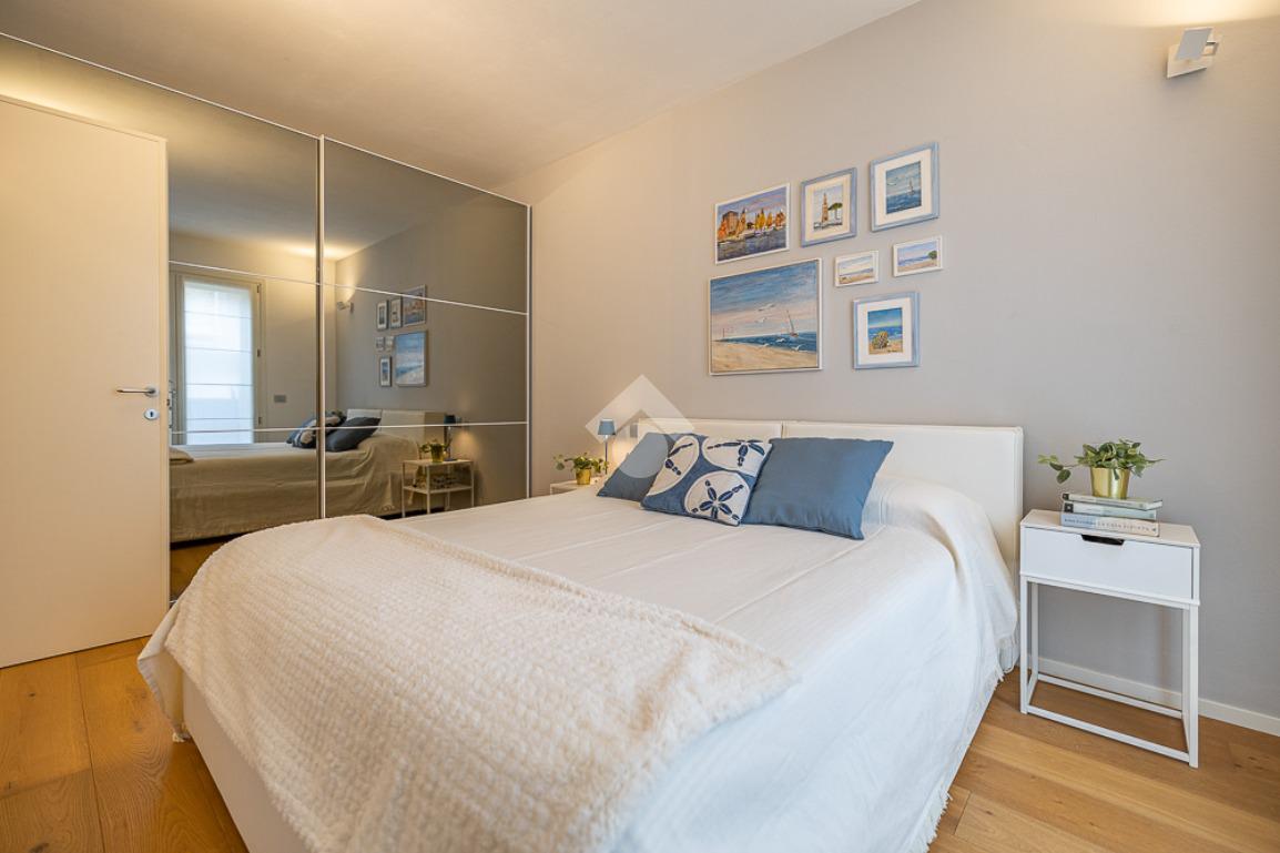 Dal disimpegno, si accede a una camera matrimoniale, dotata di balcone, e a un bagno con box doccia.