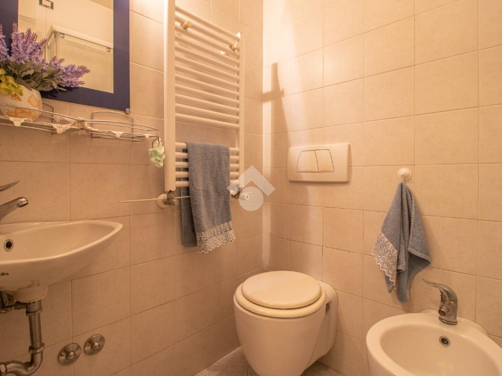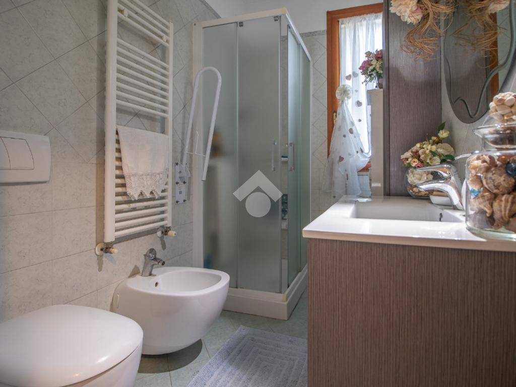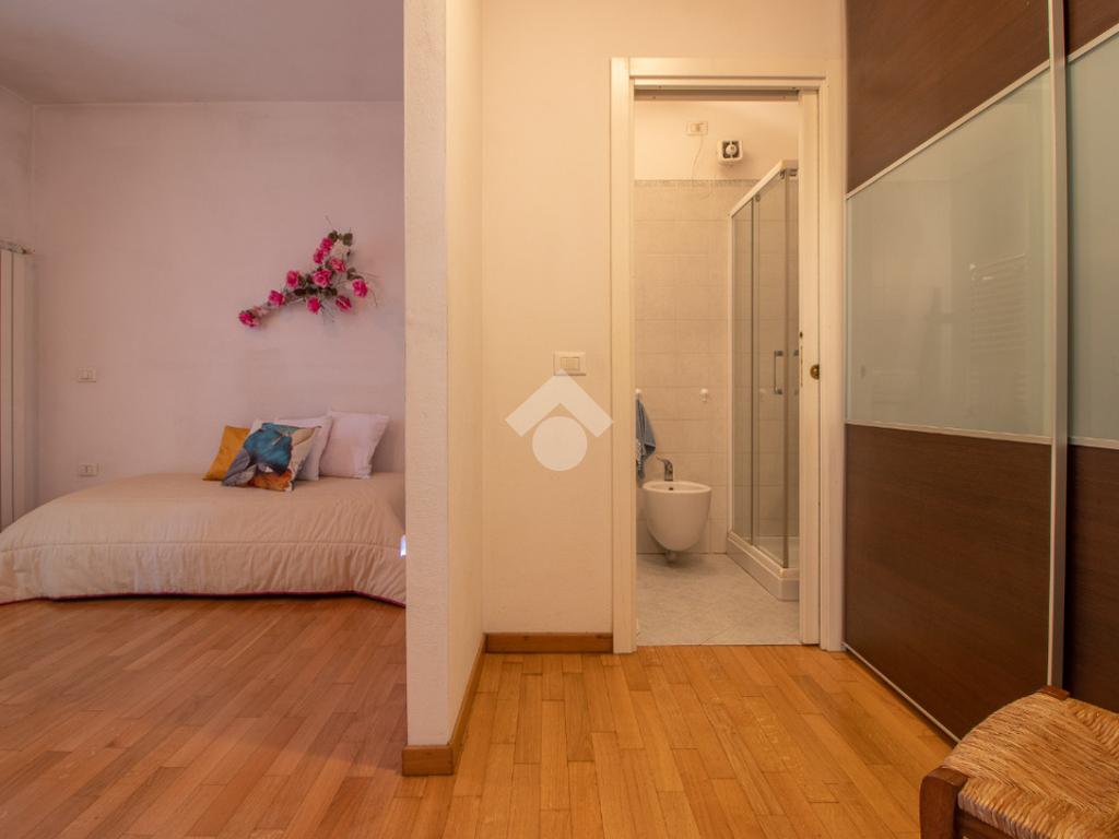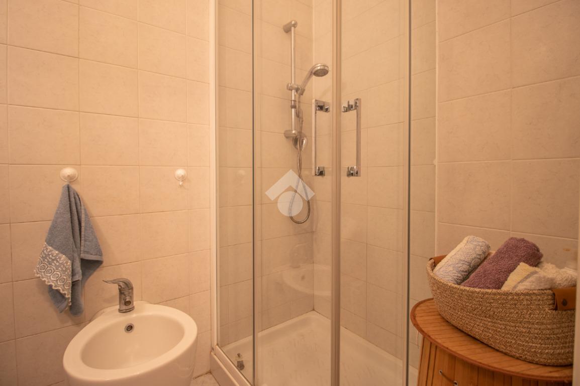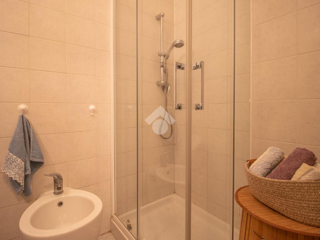 L’ingresso si apre su una confortevole zona giorno con cucina a vista, servita da un comodo bagno completo di box doccia.